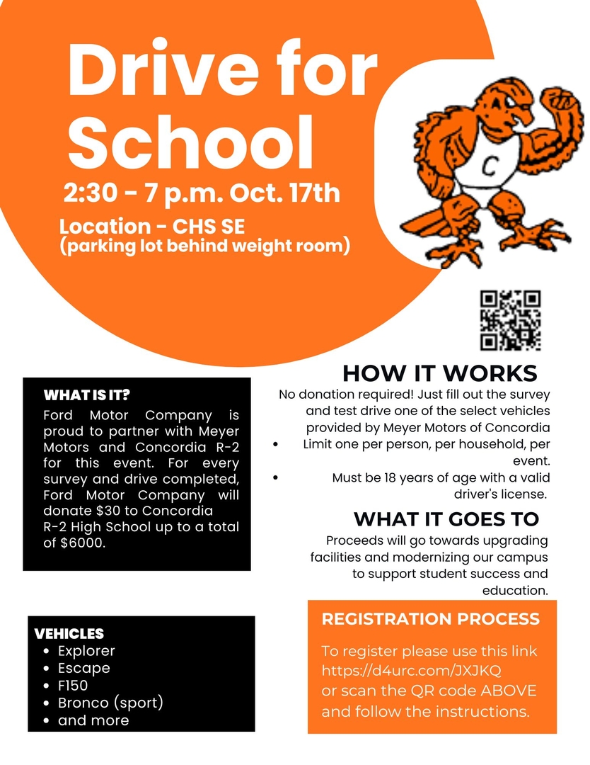 Concordia High School in conjunction with Meyer Motors Inc./Ford is hosting a Drive One 4UR School. Please help our school raise a possible $6000. Funds will help us support student success and education.